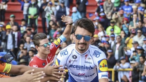 | Le Français Julian Alaphilippe pendant la parade précédant le Tour de Colombie le 9 février 2020 à Tunja. |