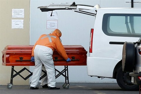 | Un employé des pompes funèbres avec le cerceuil d'une personne morte du coronavirus, le 1er juin à Santiago, devant l'hôpital San Jose. |