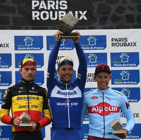 | Le coureur belge Philippe Gilbert (centre), ici sur le podium de la 117e édition de Paris-Roubaix aux côtés de Nils Politt et Yves Lampaert le 14 avril 2019, est le dernier vainqueur de "l'Enfer du Nord". |