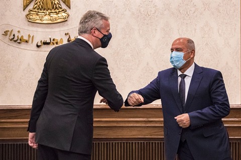 | Le ministre français de l'Économie, Bruno Le Maire (gauche), et le ministre des Transports égyptien Kamel el-Wazir, le 13 juin au Caire. |