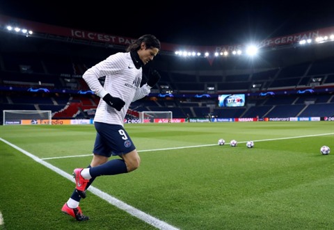| Edinson Cavani à l'échauffement avec le PSG avant son match contre le Borussia Dortmund au Parc des Princes, le 11 mars. |