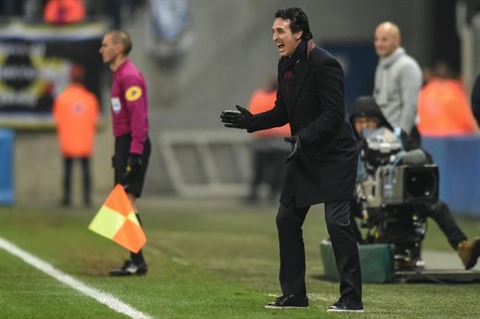 | L'entraîneur du PSG Unai Emery donne des instructions lors du match contre Sochaux à Auguste-Bonal, le 6 février |