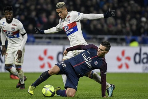 | Le milieu du PSG Giovani Lo Celso (en bas) à la lutte avec l'attaquant de l'OL Mariano Diaz, le 21 janvier à Décines-Charpieu. |