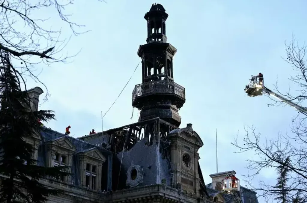 | La toiture et le beffroi de la mairie du 12e arrondissement endommagés par un incendie, le 27 janvier 2025 à Paris. |