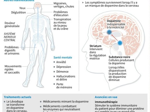 Des pistes de recherche existent, même si une application concrète est encore hypothétique et lointaine. Ainsi, selon une étude publiée l'an dernier, des cellules souches d'origine humaine ont permis d'améliorer la capacité de mouvements de singes atteints d'une forme de Parkinson. Autre piste, l'immunothérapie : stimuler le système immunitaire du patient pour éliminer une protéine qui semble jouer un grand rôle dans la maladie, l'alpha-synucléine. L'enjeu des recherches actuelles est de repérer la maladie le plus tôt possible dans l'espoir de la freiner.