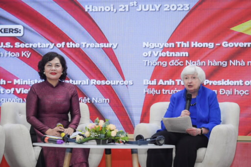 La Banque d'État du Vietnam a organisé, le 21 juillet à l'Université de commerce extérieur à Hanoï, une conférence des femmes leaders économiques sur les perspectives économiques et la finance climatique, à l’occasion de la visite officielle au Vietnam de la secrétaire américaine au Trésor, Janet Yellen.