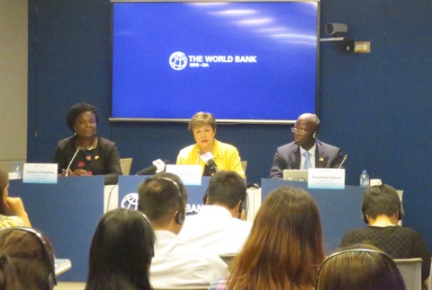| La directrice générale exécutive de la Banque mondiale, Kristalina Ivanova Georgieva (centre), lors d’une conférence de presse tenue le 23 mars à Hanoï. |
