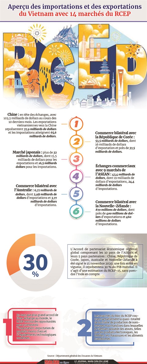 L’accès des produits vietnamiens à ces marchés sera également facilité en raison de l’application d’une même et unique réglementation sur l’ensemble de la zone. “Contrairement aux accords de libre-échange bilatéraux signés avec la Chine, le Japon, la République de Corée, l’Australie et la Nouvelle-Zélande qui imposent au Vietnam de se conformer aux règles et procédures d’exportation de chacun de ces pays pour bénéficier des réductions de droits de douane, les signataires du RCEP sont soumis aux mêmes formalités d’exportation. Les entreprises vietnamiennes seront notamment libres d’utiliser les matières premières de n’importe quel pays signataire du RCEP pour bénéficier des tarifs préférentiels de cette zone de libre-échange”, explique Nguyên Thi Quynh Nga, directrice adjointe du Département du commerce multilatéral, relevant du ministère de l’Industrie et du Commerce.