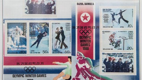 | Collection de timbres photographiée le 17 novembre 2017 célébrant les différentes participations passées des Nord-Coréens aux Jeux Olympiques. |