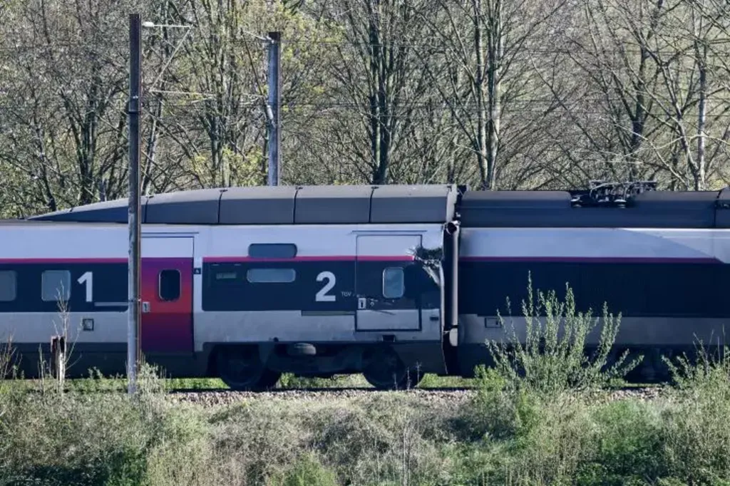 | Un wagon endommagé après une collision entre un TGV et un camion à un passage à niveau à Bully-les-Mines, entre Béthune et Lens, le 7 avril dans le Pas-de-Calais. |