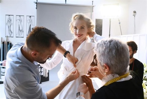| Julien Fournié et sa première couturière, Madame Jacqueline, ajustent une robe sur le mannequin Michaela Tomanova, le 30 juin 2020 à Paris. |