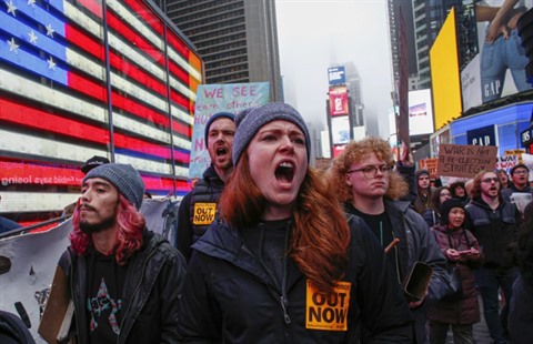 | Des manifestants contre la présence militaire américaine en Irak défilent à New York le 4 janvier. |