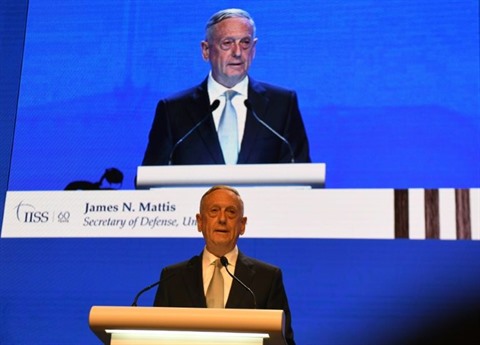 | Le secrétaire américain à la Défense James Mattis fait une déclaration lors d'une conférence sur la sécurité, le 2 juin 2018 à Singapour. |