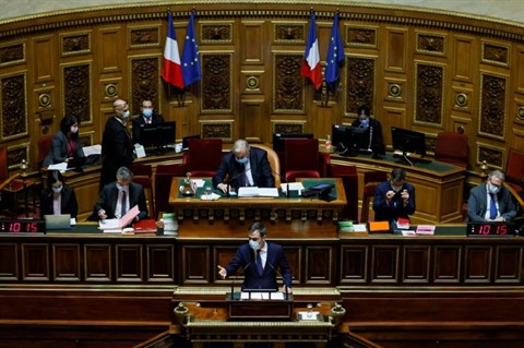 | Le ministre de la Santé, Olivier Véran, devant le Sénat, à Paris. |
