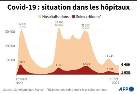 | Graphique montrant l'évolution des hospitalisations et des personnes en soins critiques en France, au 27 octobre |