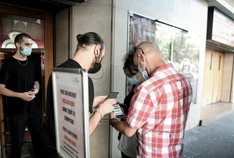 | Contrôle du pass sanitaire le 21 juillet 2021 à l'entrée du cinéma Le Grand Rex à Paris. |