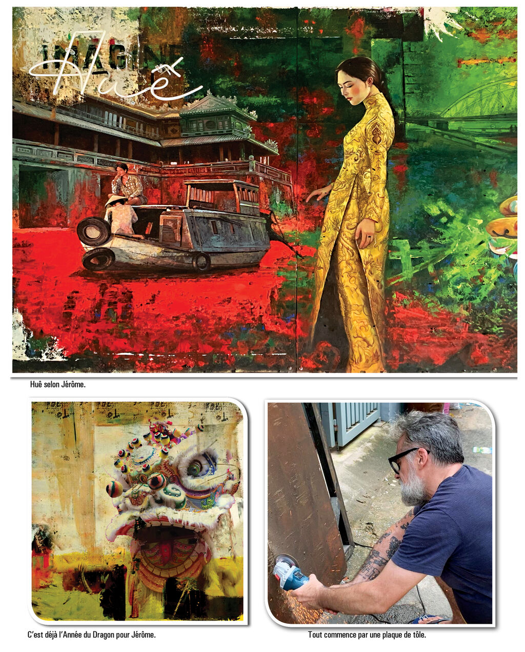 Il faut savoir que Jérôme ne peint que sur des plaques de tôles rectangulaires récupérées sur les chantiers aux alentours de Hô Chi Minh-Ville, ce qui fait de lui, au passage, un recycleur de génie. Chaque tôle minutieusement choisie apporte sa propre singularité.