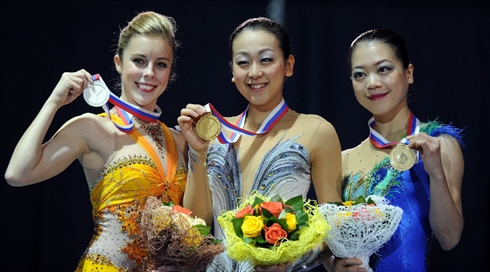 | L'Américaine Ashley Wagner (gauche), la Japonaise Mao Asada (centre) et la Japonaise Akiko Suzuki le 8 décembre à Sotchi. |