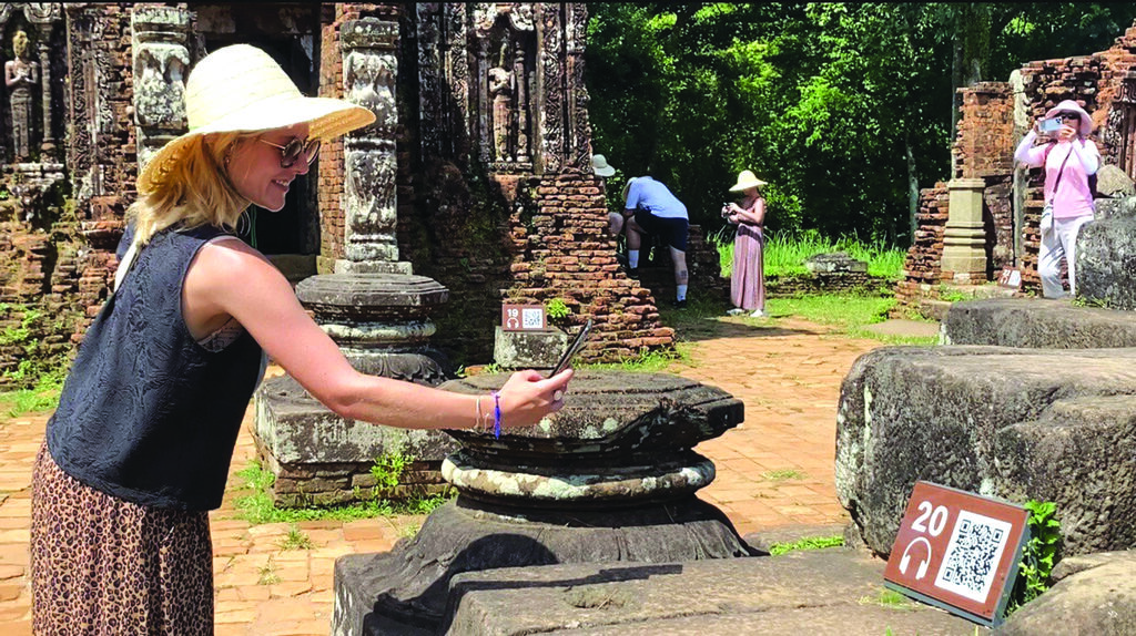 | Une visiteuse scanne le code QR pour s’informer au site touristique de My Son, ville de Dà Nang (Centre). |