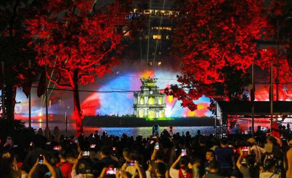 | Un spectacle de mapping 3D projeté au lac Hoàn Kiêm (Hanoï). |