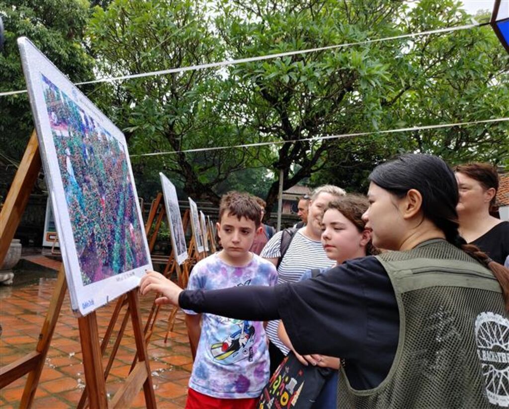 | Des touristes étrangers lors d'une exposition au Temple de la Littérature à Hanoï. |