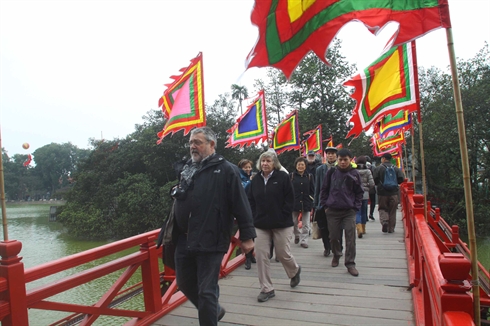 | Des touristes étrangers au temple de Ngoc Son, au cœur de Hanoi. |
