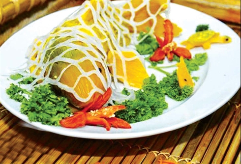 Placez la carcasse sur un plat, y disposer les paupiettes puis parer avec le râpé de concombre, de navet et de potiron, et décorer avec les fleurs de poivron rouge.