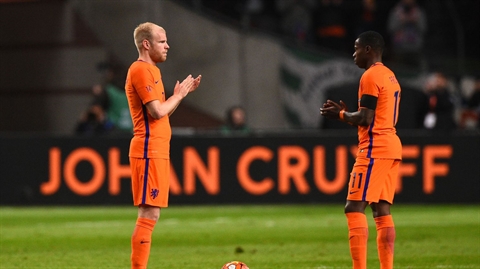 | Les milieux néerlandais Davy Klaassen et Quincy Promes lors de l'hommage à Johan Cruyff, le 25 mars à Amsterdam. |