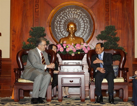 | Le secrétaire du Comité du Parti de Hô Chi Minh-Ville, Lê Thanh Hai (droite), et le maire de Rotterdam, Ahmed Aboutaleb, le 9 mars dans la mégapole du Sud. |