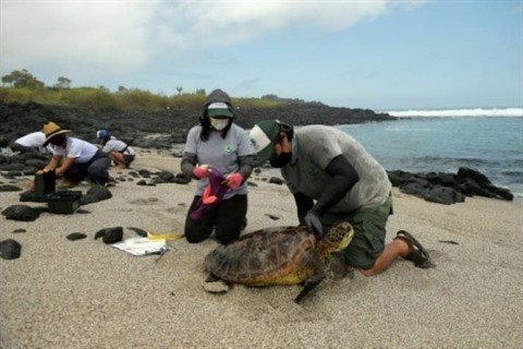 | Des gardes du Parc national des Galapagos examinent une tortue de mer, le 14 avril sur l'île Floreana. |