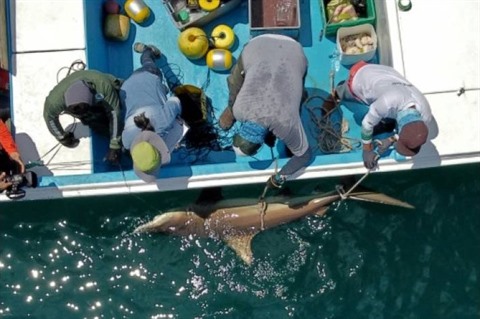 | Des gardes du Parc national des Galapagos attrapent un requin, le 17 avril sur l'île de Santa Cruz. |