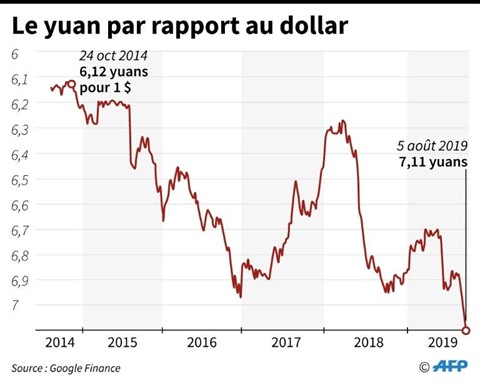 La monnaie chinoise a franchi le seuil symbolique des 7 yuans pour un dollar, un seuil qui n'avait pas été enfoncé depuis 11 ans. Autre conséquence des tensions sino-américaines, l'agence officielle Chine nouvelle a aussi annoncé dans la nuit de dimanche à lundi que les entreprises chinoises avaient cessé d'acheter des produits agricoles en provenance des États-Unis.