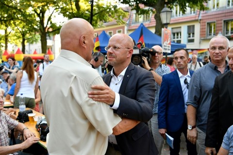 | Andreas Kalbitz, candidat de l'AfD, rencontre des électeurs en arrivant à un meeting à Koenigs Wusterhausen, en Allemagne de l'est, le 30 août 2019. |
