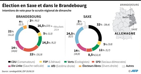 En Saxe et dans le Brandebourg, deux Länder de l'Est de l'Allemagne, quelque 5,5 millions d'électeurs sont appelés aux urnes dimanche pour élire leurs nouveaux parlements régionaux. S'il ne s'agit que d'environ 12% du corps électoral allemand, ces scrutins, complétés par un troisième en Thuringe, autre région de l'ex-RDA, le 27 octobre, seront scrutés à la loupe en Allemagne, 30 ans après la chute du Mur.