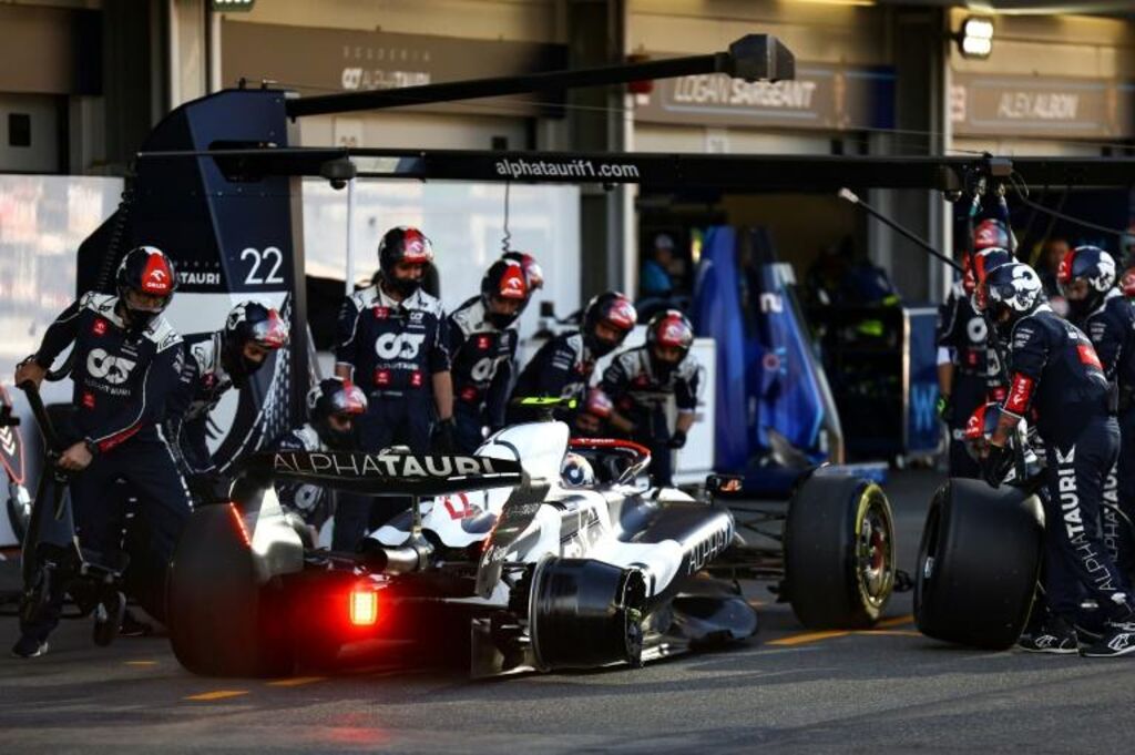 | Le pilote de Formule 1 Yuki Tsunoda (Alpha Tauri) arrêté au stand après un problème de pneu sur sa monoplace lors de la course sprint du Grand Prix d'Azerbaïdjan, le 29 avril à Bakou. |
