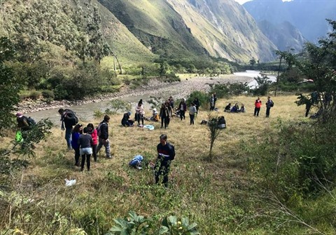 | Les passagers des trains entrés en collision patientent après l'accident près du Machu Picchu, au Pérou, le 31 juillet. |