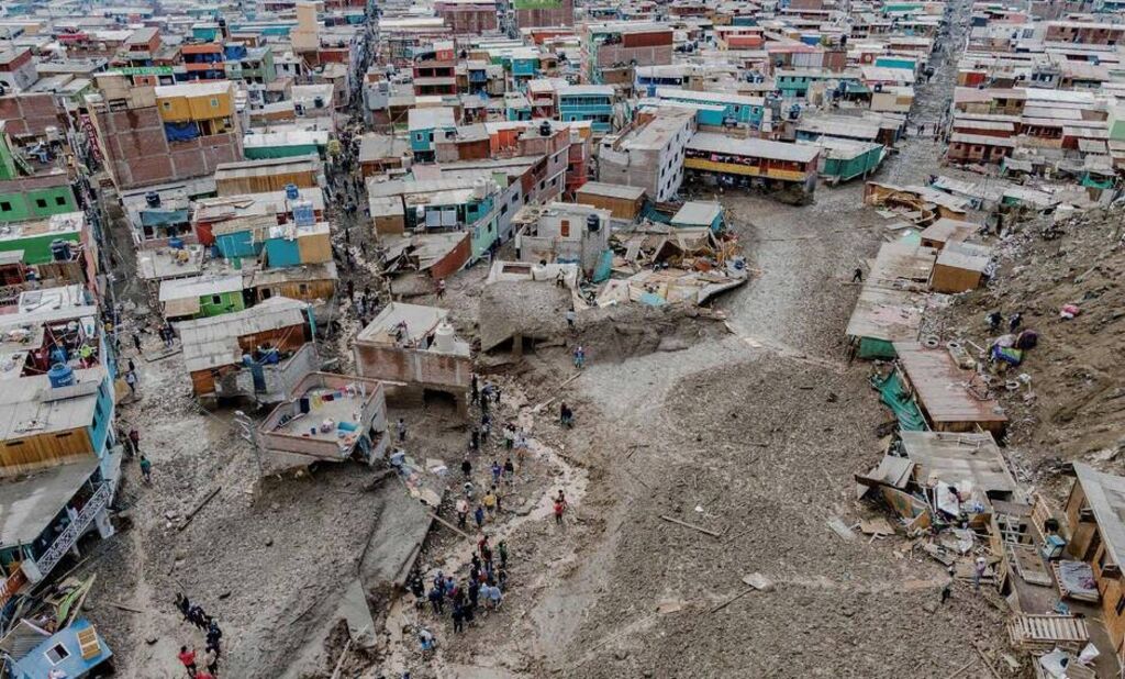 | Photo aérienne montrant les destructions causées par une coulée de boue engendrée par de fortes pluies dans la province de Camaná, dans le Sud du Pérou, le 8 février. |