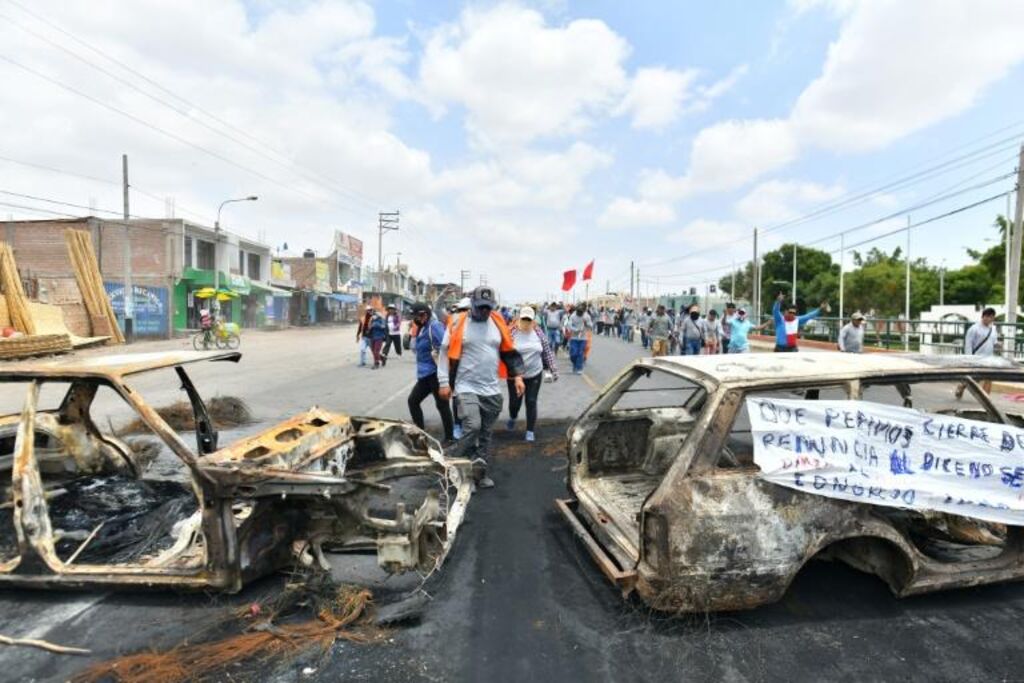 | Des partisans du président déchu Pedro Castillo bloquent une autoroute à La Joya, dans la région d'Arequipa, le 16 décembre 2022 au Pérou. |