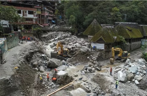 | Des travailleurs déblaient les rues après des inondations causées par des pluies torrentielles à Machu Picchu, au Pérou, le 25 janvier. |