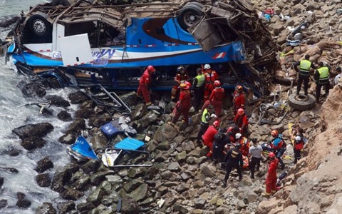 Le car, qui se dirigeait vers la capitale péruvienne depuis la ville de Huacho (Centre), transportait 53 passagers. Sur les images de la télévision locale, le véhicule se trouvait sur le toit, au pied de la falaise et à quelques mètres de la mer, l'habitacle enfoncé par la violence de l'impact.