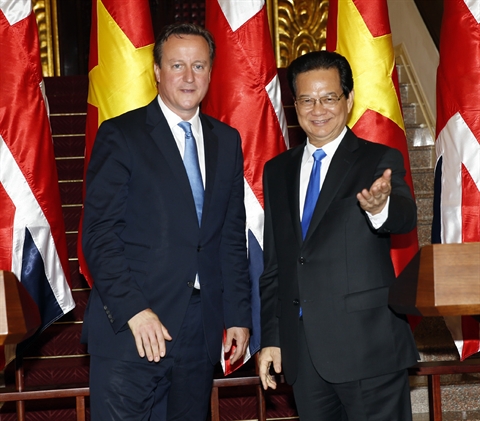 | Le Premier ministre vietnamien Nguyên Tân Dung (droite) et son homologue britannique David Cameron, le 29 juillet à Hanoi. |