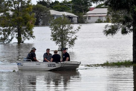 | Des habitants en bateau dans une rue inondée à Lawrence (Nouvelle-Galles du Sud, en Australie), le 2 mars. |