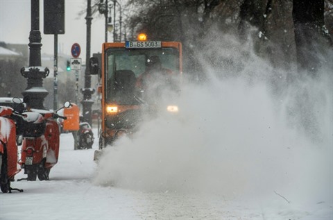 | Nettoyage de la neige sur le trottoir près du château de Charlottenbourg, à Berlin (Allemagne), le 9 février. |
