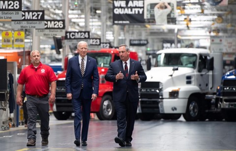 Le président américain Joe Biden (centre) visite une usine de camions à Macungie (Pennsylvanie) le 28 juillet. Photo : AFP/VNA/CVN |