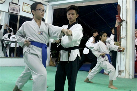 | Le taekwondoïste Nguyên Minh Van (droite) est capable d’endosser le statut d’entraineur. |