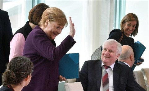 | La chancelière Angela Merkel sourit après le déclin de sa poignée de main par le ministre de l'Intérieur, Horst Seehofer, le 2 mars à Berlin. |