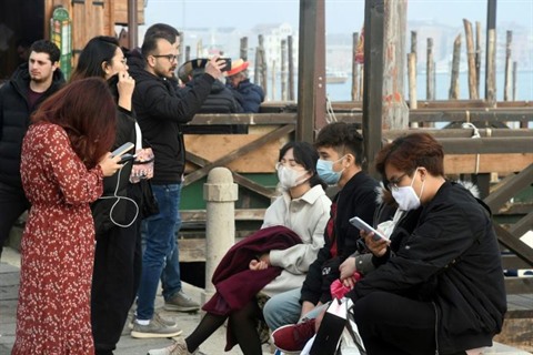 | Des touristes avec des masques de protection à Venise (Italie), le 25 février. |