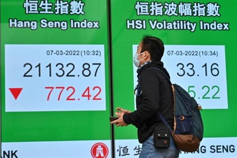 | Un écran montre les cours des indices boursiers, le 7 mars dans une rue de Hong Kong |