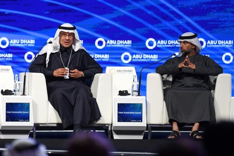 | Le ministre saoudien de l'Énergie, Abdelaziz ben Salmane (gauche), aux côtés de son homologue des Émirats, Souheil al-Mazrouei, lors d'un sommet à Abou Dhabi sur la durabilité des énergies, le 14 janvier 2020. |