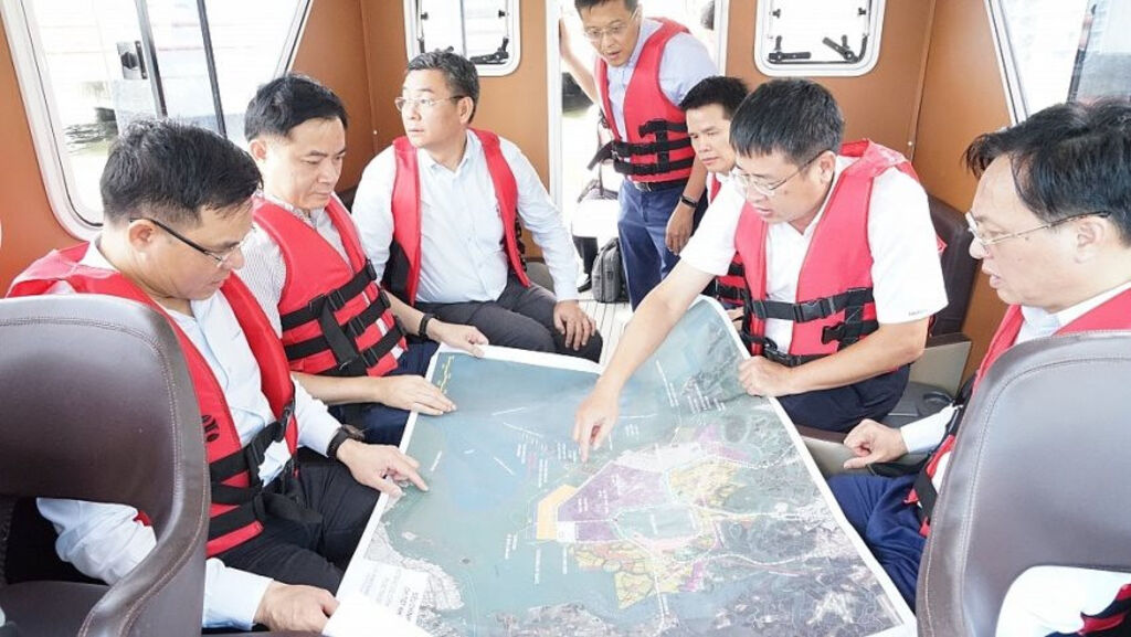 | Les dirigeants de PetroVietnam inspectent la zone où seront construits un complexe pétrochimique et une réserve pétrolière dans le parc industriel pétrolier de Long Son, au Sud. |